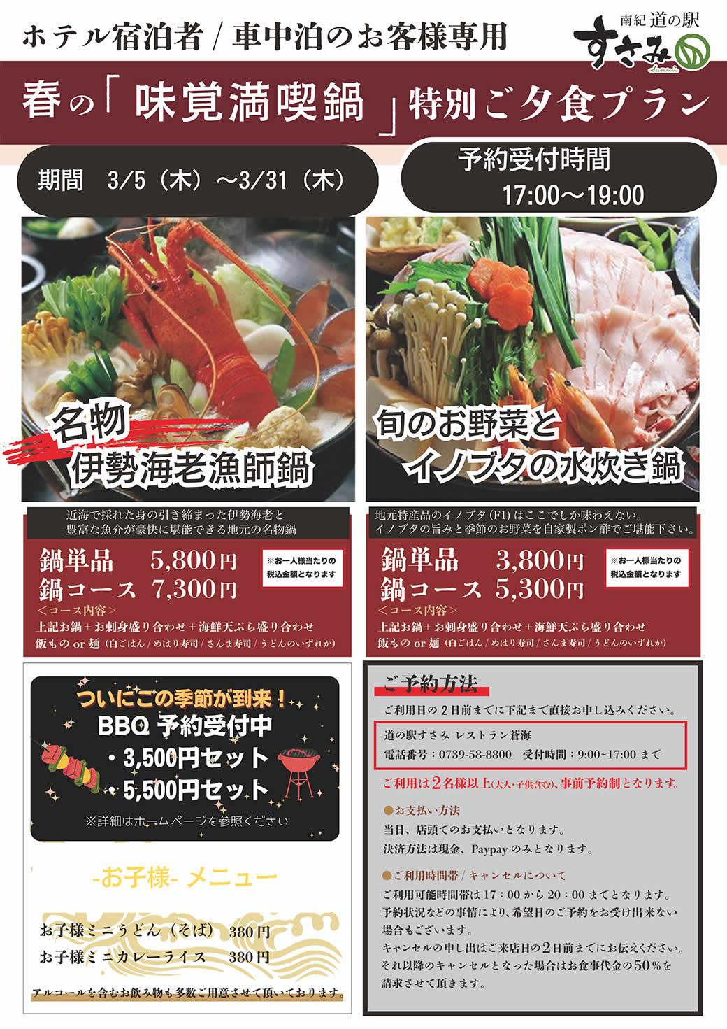 17時~20時(19時最終入店)の間は完全予約制にてお鍋やバーベキューを愉しめる場として再開いたします。