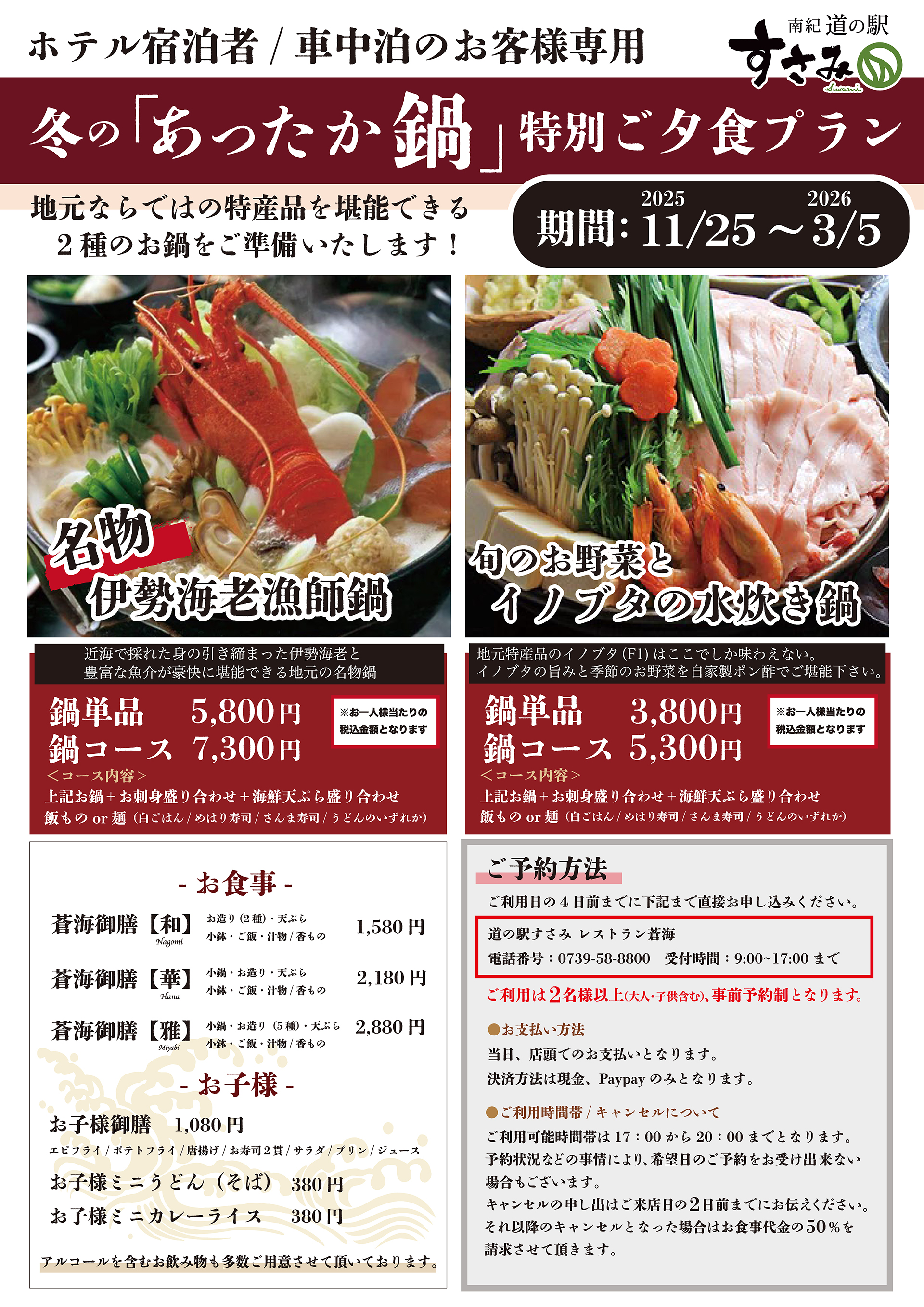 冬期の期間は2名様以上、事前予約制にてレストラン蒼海でご夕食を用意できます。この期間だけのメニューとして